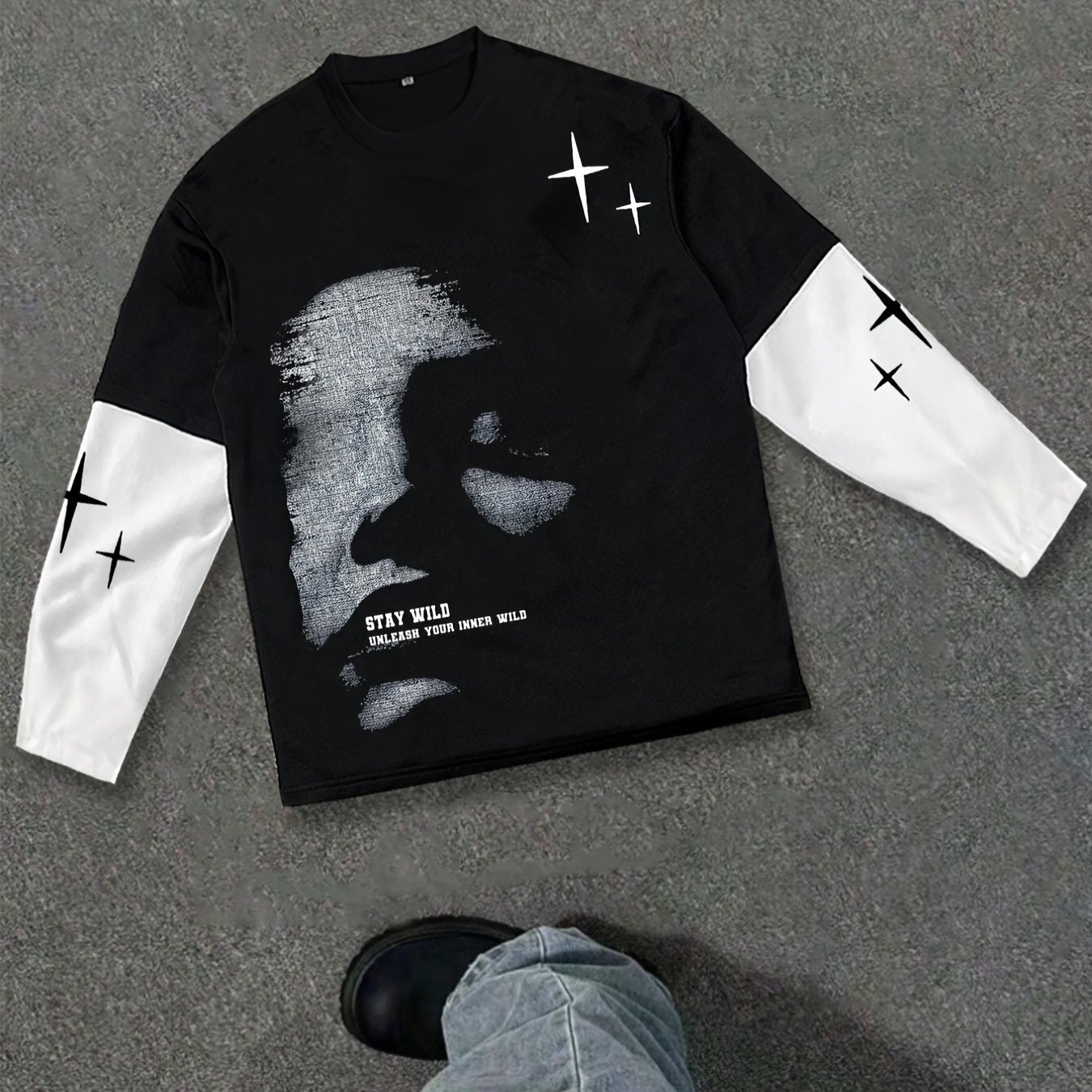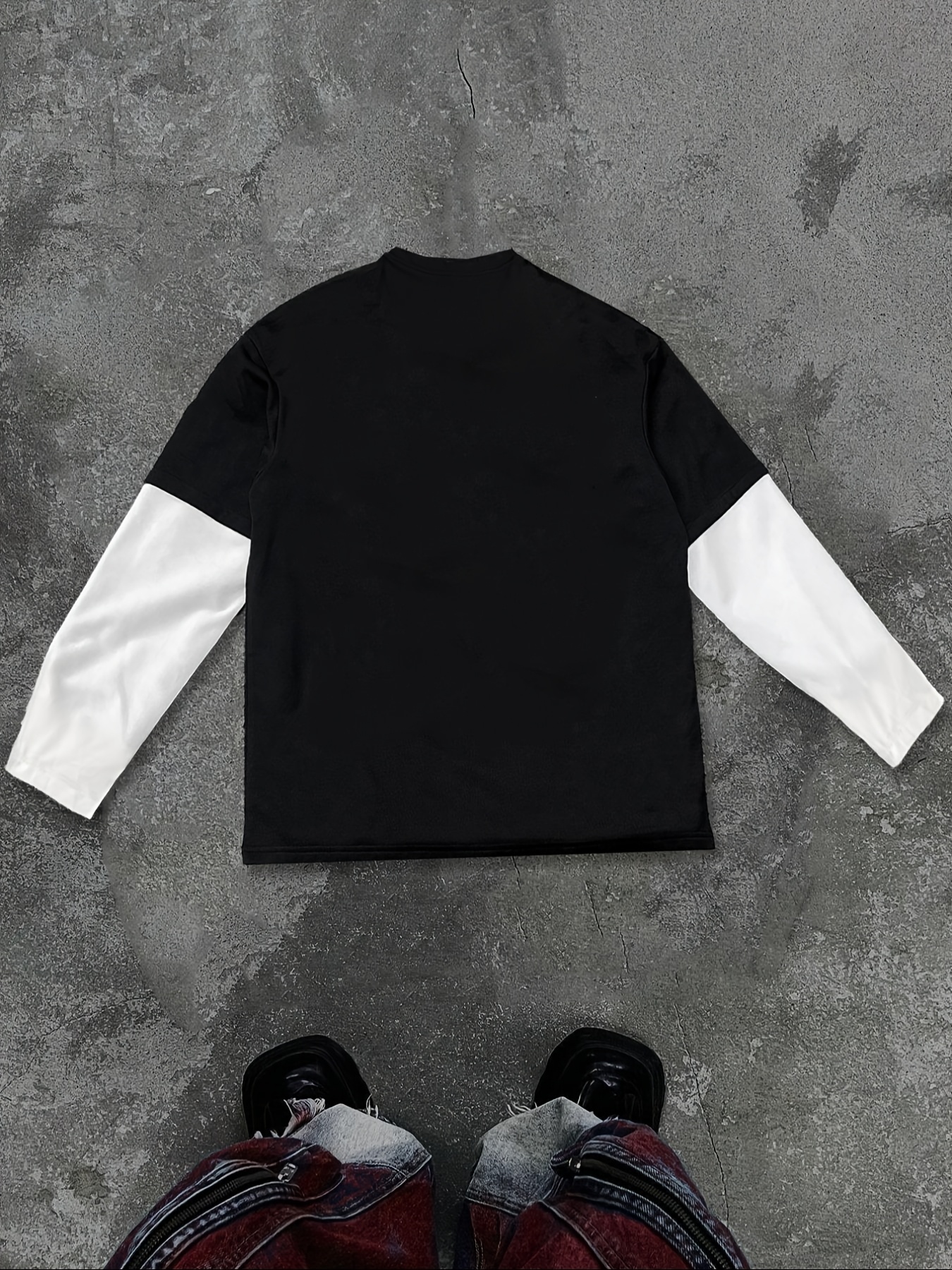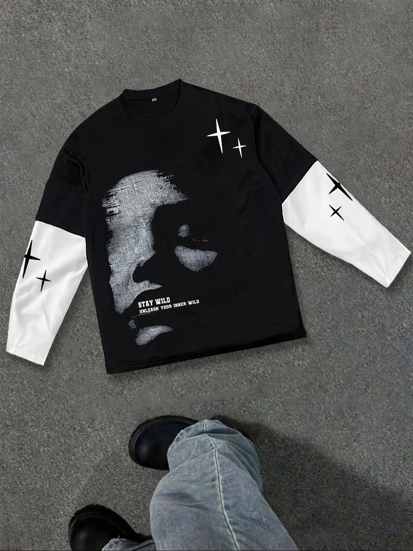 1171# Men's Spring/Autumn Patchwork 2-in-1 Look Long-Sleeve Trendy Letter Print Top, Autumn/Winter Outdoor Sports & Casual Wear